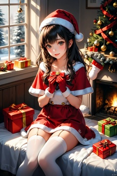 a girl sitting on a bench in front of a christmas tree with presents around her and a christmas tree behind her, 1girl, antlers, bell, blonde hair, bobblehat, bow, bowtie, box, cake, candle, candy, candy cane, capelet, carrying over shoulder, chimney, christmas, christmas lights, christmas ornaments, christmas tree, deer ears, fake antlers, fake facial hair, fake mustache, fireplace, food, fur-trimmed capelet, fur-trimmed dress, fur-trimmed headwear, fur-trimmed skirt, fur trim, gift, gift bag, gift box, giving, hair bell, hat, heart-shaped box, holding box, holding candy, holding gift, holding sack, holly, incoming gift, indoors, looking at viewer, merry christmas, neck bell, ornament, party hat, party popper, pine tree, pom pom \(clothes\), red bow, red bowtie, red capelet, red gloves, red headwear, reindeer, reindeer antlers, reindeer costume, ribbon bondage, sack, santa bikini, santa boots, santa costume, santa dress, santa gloves, santa hat, sitting, snow, snowflake background, snowflake print, snowflakes, snowing, snowman, solo, star \(symbol\), tail bell, tail ornament, thighhighs, white legwear, window, wreath