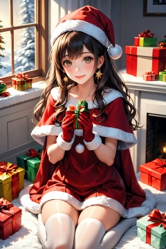 a girl sitting on the floor with presents around her and a christmas tree in the background with a lit candle, 1girl, animal costume, antlers, bell, blue capelet, bobblehat, box, cake, candle, candy, candy cane, capelet, carrying over shoulder, champagne, chimney, christmas, christmas lights, christmas ornaments, christmas tree, deer ears, earrings, envelope, fake antlers, fake facial hair, fake mustache, fireplace, fur-trimmed capelet, fur-trimmed dress, fur-trimmed gloves, fur-trimmed headwear, fur-trimmed shorts, fur-trimmed skirt, fur-trimmed sleeves, fur trim, gift, gift bag, gift box, giving, glint, green ribbon, hair bell, happy valentine, hat, heart-shaped box, heart-shaped chocolate, holding bag, holding box, holding candy, holding gift, holding sack, holly, in box, in container, incoming gift, indoors, jeanne d'arc alter santa lily \(fate\), jewelry, jingle bell, kneeling, letter, long hair, looking at viewer, merry christmas, naked ribbon, neck bell, ornament, party hat, party popper, pine tree, pinwheel, pom pom \(clothes\), red bow, red capelet, red gloves, red headwear, red sleeves, reindeer, reindeer antlers, reindeer costume, ribbon bondage, sack, saint quartz \(fate\), santa bikini, santa boots, santa costume, santa dress, santa gloves, santa hat, sitting, smile, snow, snowflake background, snowflake hair ornament, snowflake print, snowflakes, snowing, snowman, solo, star earrings, streamers, tail bell, tail ornament, valentine, white day, white footwear, window, wreath, yellow ribbon