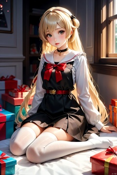 a girl sitting on the floor with presents around her, an anime drawing by Yang J, pixiv contest winner, fantasy art, beautiful anime girl, cute anime girl, cute anime waifu in a nice dress, anime visual of a cute girl, anime girl with long hair, pretty anime girl, attractive anime girl, beautiful anime woman, young anime girl, (anime girl)