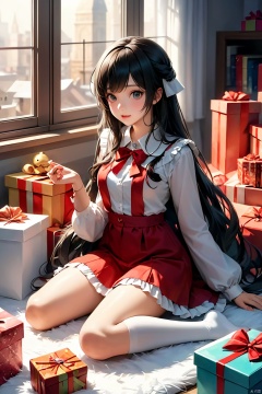 a girl sitting on the floor with presents around her, an anime drawing by Yang J, pixiv contest winner, fantasy art, beautiful anime girl, cute anime girl, cute anime waifu in a nice dress, anime visual of a cute girl, anime girl with long hair, pretty anime girl, attractive anime girl, beautiful anime woman, young anime girl, (anime girl)