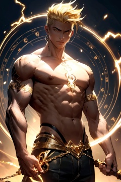 1boy, blonde hair, dark-skinned male, dark skin, earrings, electricity, jewelry, lightning, magic circle, male focus, muscular, solo