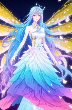 (8k, RAW photo, best quality, masterpiece:1.2),(realistic, photo-realistic:1.1),ultra-detailed,extremely detailed cg 8k wallpaper,(crystalstexture skin:1.4),(extremely delicate and beautiful),1girl, solo, long hair, blue hair, dress, wings, multicolored hair, bare shoulders, very long hair, brown eyes, antenna hair, butterfly wings, butterfly, bug, looking at viewer, hair ornament, breasts,full body, long hair, yellow eyes, blue hair, dress, bare shoulders, wings, breasts, purple hair, upper body,((looking at viewer)), 1girl,, flower_field, lips, , <lora:twt1:0.8>