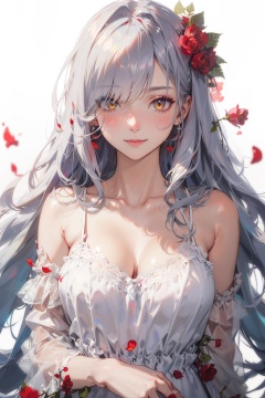 masterpiece,best quality,1girl,solo,looking at viewer,silver hair,yellow eyes,beautiful and detailed face,evil smile,upper body,collarbone,collarbone,large breasts,white long translucent night gown,expressionless,hair cover one eye,long hair,red hair flower,standing,blood,(plenty of red petals:1.35),white background,simple background