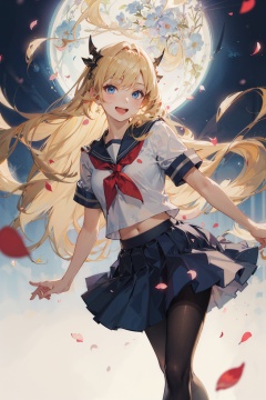 (best quality),((masterpiece)),(highres),illustration,original,extremely detailed,1girl,solo,pantyhose,long hair,solo,school uniform,blonde hairserafuku,skirt,black pantyhose,blue eyes,petals,hime cut,smile,open mouth,very long hair,