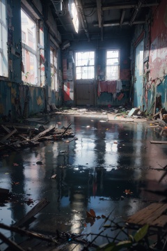 masterpiece,best quality,(ray tracing, reflection light, film grain),dark sky, heavy rain, inside abandoned building, low water level,realistic background,light particle