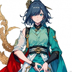 (masterpiece:1.3),(the best quality:1.2),(super fine illustrations:1.2),(Masterpiece),high quality,high detail,(white background:1.2),looking at viewer,(SOLO:1.4),outline,simple background,fullbody,shoulder armor, hair ornament,hair over one eye,grey hair,shirt,ponytail,long sleeves,tassel,black footwear,floral print,hair bell,jacket,hanfu,jewelry,earrings,fu_hua,hair_over_one_eye,chinese_clothes,blue_eyes