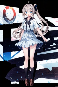 1girl, solo, long hair, blue eyes, loafers, socks, skirt, bow, very long hair, shoes, open mouth, full body, brown footwear, ponytail, hand on hip, smile, belt, school uniform, blue socks, ahoge, short sleeves, pleated skirt, standing, black socks, breasts, hair bow, bangs, sailor collar, bowtie, shirt, hand on own chest, ^_^, white sailor collar, kneehighs, white shirt, :d, medium breasts, facing viewer, serafuku, miniskirt, grey hair, blue skirt, red bow, black bow, black skirt,