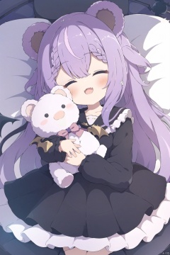 1girl, solo, animal ears, stuffed toy, on back, stuffed animal, dress, lying, purple hair, closed eyes, tail, braid, smile, frills, teddy bear, black dress, good shade, long sleeves, long hair, pillow, blush, bangs, facing viewer, fang, very long hair, :d, demon girl, frilled dress, demon tail, bear ears, frilled pillow, star \(symbol\), hair between eyes