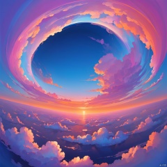 Pink blue, orange, blue Purple gradient, curly clouds, stirring,sky,stratosphere, away from land, away from sea, huge hollow in the very center of the picture, shadows all over, dawn breaks, skyline, less spherical elements, more clouds