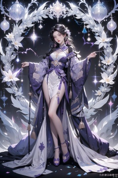 1girl,urple hair, purple eyes, glowing eyes, electricity,Silk stockings, jackets, lightning, Short skirt,Artifacts,purple magic, aura, full body,magic circle, braids,very long hair,hair flowe,tarry sky ,