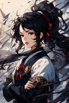 02693-3732785628-1girl,solo,long hair,ponytail,black hair,blurry,upper body,blurry background,crossed arms,hair ribbon,ribbon,lips,mole,black eye