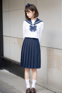 signature, good anatomy, good proportions, shapely body,  1girl, solo, skirt, school uniform, brown footwear, socks, brown hair, serafuku, white socks, shoes, bag, blue skirt, arms behind back, pleated skirt, standing, full body, loafers, bow, shirt, sailor collar, realistic, white shirt, bowtie, medium hair, bangs, blue sailor collar, brown eyes, short hair, closed mouth, long sleeves, lips, trash bag, blue bow, looking down