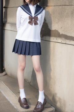 signature, good anatomy, good proportions, shapely body,  1girl, solo, skirt, school uniform, brown footwear, socks, brown hair, serafuku, white socks, shoes, bag, blue skirt, arms behind back, pleated skirt, standing, full body, loafers, bow, shirt, sailor collar, realistic, white shirt, bowtie, medium hair, bangs, blue sailor collar, brown eyes, short hair, closed mouth, long sleeves, lips, trash bag, blue bow,