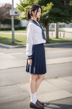 signature, good anatomy, good proportions, shapely body,  1girl, solo,  skirt, photo background, school uniform, socks, shirt, white socks, pleated skirt, blue skirt, white shirt, shoes, long sleeves, head out of frame, loafers, brown footwear, serafuku, standing, legs, sailor collar, thighs, full body, from side, outdoors, necktie