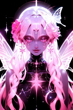 a close up of a person with a butterfly on a black background, astral fairy, glowing angelic being, psychedelic goddess, space flower fairy, wearing psychedelic wicca, magical being, cosmic goddess, cosmic horror entity with wings, astral appearance, ethereal angelic being of light, magical fairy floating in space, some cosmic angels, celestial goddess, jen bartel, techno mystic goddess