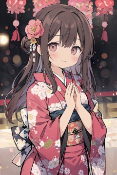 1girl, bangs, blurry, blurry background, blurry foreground, blush, brown eyes, brown hair, closed mouth, depth of field, eyebrows visible through hair, floral print, flower, hair bun, hair flower, hair ornament, happy new year, japanese clothes, kimono, long sleeves, looking at viewer, new year, obi, own hands together, pink flower, pink rose, print kimono, purple flower, red flower, red kimono, smile, solo, upper body, wide sleeves