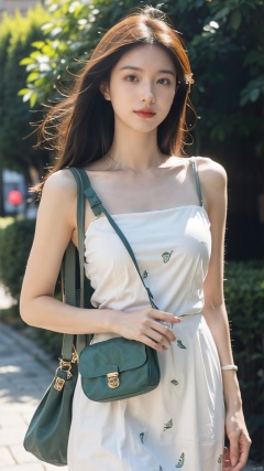 The image features a confident young woman standing outdoors on a green carpet. She is wearing a white dress with a green alligator print and carries a brown shoulder bag. Her posture and facial expression convey a sense of determination. The lighting is soft and flattering, casting a warm glow on her skin. The color palette is predominantly green and brown, with a dynamic contrast between the two. The woman's outfit, pose, and facial expression all work together to create a powerful and memorable image.