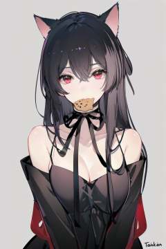 -1girl, solo, animal ears, long hair, red eyes, breasts, cat ears, looking at viewer, cleavage, bare shoulders, ribbon, mouth hold, upper body, dress, simple background, collarbone, black dress, black hair, black ribbon, hair between eyes, bangs, choker, ribbon choker, off shoulder, food, food in mouth, medium breasts, spaghetti strap, shawl, neck ribbon, signature, taiyaki, sleeveless,cat girl,<lora:cat girl-000018:0.8>,