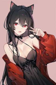-1girl, solo, breasts, red eyes, long hair, dress, cleavage, black hair, black dress, red jacket, jacket, open jacket, looking at viewer, bow, long sleeves, collarbone, off shoulder, bare shoulders, open clothes, simple background, open mouth, choker, sleeveless dress, bangs, hair between eyes, black bow, sleeveless, hair bow, very long hair, head tilt, pink background, :o, hand up, medium breasts, spaghetti strap, large breasts, ribbon, upper body, black choker, chocolate,cat girl,<lora:cat girl-000018:0.8>,