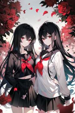 -multiple girls, 2girls, red eyes, long hair, skirt, school uniform, serafuku, black skirt, black hair, red neckerchief, black serafuku, neckerchief, petals, shirt, pleated skirt, looking at viewer, sailor collar, long sleeves, black shirt, flower, closed mouth, bangs, very long hair, blurry, rose, black sailor collar, hair between eyes, blurry background,cat girl,<lora:cat girl-000018:0.8>,