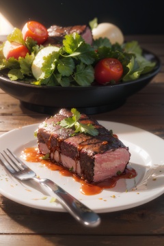 masterpiece,best quality,(ray tracing,cinematic lighting),realistic,close-up,still life,no humans,food,meat,leaf,vegetable,plate