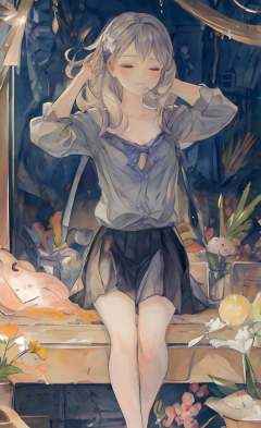 detailed manga illustration,(masterpiece),(best quality),Amazing,beautiful detailed,extremely detailed wallpaper,extremely detailed CG unity 8k wallpaper,an extremely delicate and beautiful,perfect face, sidelighting, lustrous skin, (shine), lighting, depth of field, perspective,1girl, solo, skirt, flower, hair flower, hair ornament, long hair, full body, school uniform, mirror,((adjusting hair)),arms_up,((hair_in_mouth)),mouth_hold,closed_eyes,open_shirt,see_through,collarbone,off_shoulder,sfw,blush,light_smile,detailed background, <lora:13机兵Google:1>