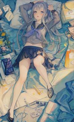 full body, leg, feet, nsfw, 1girl, underwear, long_hair,plant, potted_plant, skirt, solo, purple_eyes, blue_shirt, no_shoes, socks, blue_skirt, pleated_skirt, white_hair, sailor_collar, serafuku, long_sleeves, ribbon, indoors, {highres}, original, extremely detailed wallpaper, 1girl,{an extremely delicate and beautiful},bokeh,light leaks, original, extremely detailed wallpaper,{best quality}, {{masterpiece}}, {highres},miniskirt, looking at viewer,white panties, pantyshot, lying , on bed,black black footwear,arms behind head,rope, bound wrists,,blush, shy,spread legs, vibrator, egg vibrator, remote control vibrator, open mouth, vibrator in panties,<lora:13机兵Google:0.8>