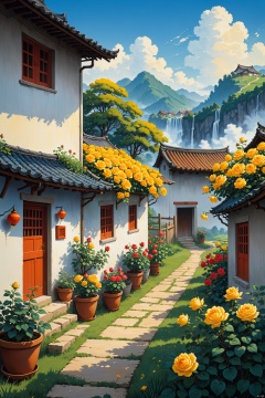 Thick painted Chinese cartoons, farmer paintings, Feng Zikai, textbook illustrations, Eastern poetry and painting, children's illustrations, 1980s illustrations, Swiss small towns, rural vegetable gardens, wells, fences, waterfalls, landscapes, houses, outdoor, sky, windows, plants, sky, grass, clouds, potted plants, trees, doors, flower pots, blue sky, architecture, chimneys, yellow flowers, roses, 24K, masterpieces, the best quality, novel illustration style, depicting rural life, Warm visuals, children's book illustrations, official art, digital painting, meticulous character portrayal, clear facial features, complete fingers, perfect composition,