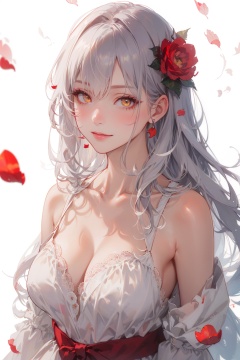 masterpiece,best quality,(realistic:1.2),1girl,solo,looking at viewer,silver hair,yellow eyes,beautiful and detailed face,evil smile,upper body,collarbone,collarbone,large breasts,white long translucent night gown,expressionless,hair cover one eye,long hair,red hair flower,standing,blood,(plenty of red petals:1.35),white background),simple background,