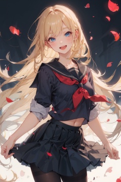 (best quality),((masterpiece)),(highres),illustration,original,extremely detailed,1girl,solo,pantyhose,long hair,solo,school uniform,blonde hairserafuku,skirt,black pantyhose,blue eyes,petals,hime cut,smile,open mouth,very long hair,