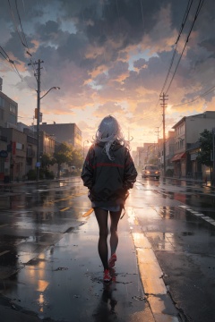 masterpiece,best quality,(ray tracing, cinematic lighting),ex-light,(central composition, Centered Composition and Symmetry:0.6),(back to camera:1.3),backlight,1girl,((solo)),black long hair,messy hair,jacket,pantyhose,rainy day,Cumulonimbus Cloud,(put hands in pockets),(outdoors, rain, sky, deserted streets, watered-down pavements, crossroad, fork in the road),tall buildings,bell towers,glass,reflections,streetlights,sunset,Tyndall Effect,