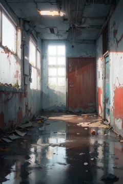 masterpiece,best quality,(ray tracing, reflection light, film grain),dark sky, heavy rain, inside abandoned building, low water level,realistic background,light particle