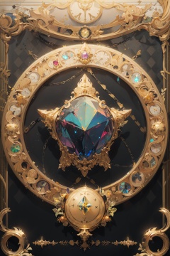 masterpiece, best quality,no human,gold line, gold, argyle, argyle background,gem, glowing, gold trim, jewelry, magic circle,symbol,crystal, fantasy, still life, badge