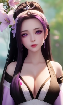 (,1girl, ,best quality, ),looking at viewer, <lora:411-DA-太一剑仙传-季师师:0.8> ,ultra detailed 8k cg,ultra detailed background,ultra realistic 8k cg,1girl, solo,(bare shoulders:0.85),(masterpiece, best quality),((oil painting style)),sexy young lady,(beautiful face and eyes),(upper body:1.5),(whole body:1.05),(single person:1.2),surrounded by flowers, (lily), roses, floret, vegetation, white, purple, purplish pink,Impressionism,colorful,(Breast size:1.3),(cleavage), blurry, depth_of_field, blurry_background, 1girl, blurry_foreground, black_hair, mole, solo, lips, motion_blur, nose, makeup,