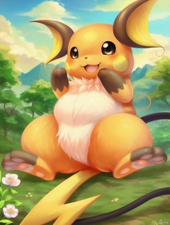 Masterpiece, best quality,raichu,beautiful landscape, solo, no human, happy, pokemon \(creature\), beautiful eyes, fat, flower, , full body, fine hair, a tail, (delicate fur:1.2), (many hair:1.3),3 toes, Brown toes,