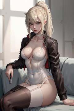 tess, 1girl, ponytail, blonde hair, blue eyes, choker,open clothes, leotard, cropped jacket, open jacket, white stocking, garter straps , cleavage, thighhighs, sitting,indoor, gun, handgun, holding gun, fire, shoting,masterpiece, best quality, 8k