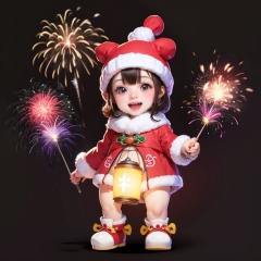 merrychristmas,bubble bobble, rabbit, dragon's hat, dragon's skin, fireworks, open mouth, solo, no humans, smile, black eyes, standing, black background, blush, lantern, aerial fireworks, full body