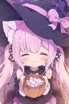 1girl, solo, witch hat, shirt, hat, animal ears, white shirt, closed eyes, facing viewer, pink hair, bow, skirt, hair ornament, twintails, blush, closed mouth, polka dot scrunchie, long sleeves, cat ears, smile, halloween bucket, animal ear fluff, frilled skirt, halloween, good shade, long hair, ^ ^, bangs, pink bow, holding, bat hair ornament, black skirt, striped, striped bow, frills, sleeveless, polka dot, food, very long hair, black headwear, polka dot bow, hands up, sleeves past wrists, black bow, detached sleeves, purple bow, purple skirt, cat girl, hat bow, black sailor collar