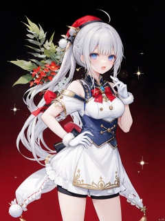 est quality, masterpiece, A girl like princess, (ginka), silver hair, ponytail, butterfly hair ornament, ahoge, bell, blush, christmas, christmas ornaments, christmas tree, flower, food, fur trim, gift, gloves, blue eyes, hat, holly, looking at viewer, open mouth, red flower, santa hat, shorts, smile, solo, sparkle, star \(symbol\), white gloves, ginka