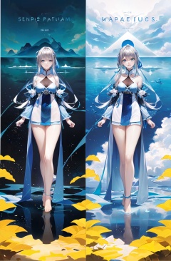simple_white_background, golden and white theme, Sense of coordination, sense of order, mathematics beauty, (((cover design))), (((((cover art))))), ((trim)), album_art, official art, (Master's work), full body, ( closeup, 1girl,solo:1.2), <lora:guizhong-v100-000029:0.8:lbw=OUTALL>, guizhong, 1girl, long hair, barefoot, dress, blue eyes, chinese clothes, cloud, sky, leaf, Cloud patterns, Chinese pattern, white geometry, colorful geometry, reflection, crystal_art, pattern_design, creative, Mystery pattern, colorful crystal decorate, blue crystal, (architectural art), ((geometric art)), pattern design, creative, shine, dream, swimming in ocean, ------, Low saturation, grand masterpiece, Perfect composition, film light, light art,