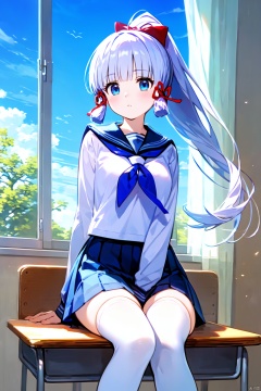 1girl, kamisato ayaka, school uniform, solo, skirt, thighhighs, blue eyes, sky, sitting, desk, long hair, serafuku, ponytail, white thighhighs, looking at viewer, bag, bangs, sailor collar, pleated skirt, cloud, shirt, curtains, window, school bag, blue sky, ribbon, long sleeves, blue skirt, hair ribbon, white shirt, bow, indoors, blunt bangs, alternate costume, white hair, hair bow, parted lips, red ribbon, paper, neckerchief, day, floating hair, sidelocks, school desk, wind, blue neckerchief, tress ribbon, blush, on desk, zettai ryouiki, feet out of frame,