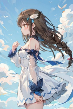 1girl, long hair, bird, brown hair, braid, dress, cloud, solo, sky, feathers, day, breasts, white dress, bare shoulders, animal, blush, profile, cleavage, brown eyes, blue sky, long sleeves, from side, very long hair, outdoors, detached sleeves, hair ornament, wind, cloudy sky, bird on hand, medium breasts