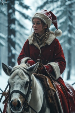 1girl,shengdan,snow,antler,santa costume,depth of field, Riding, <lora:shengdan:0.7>