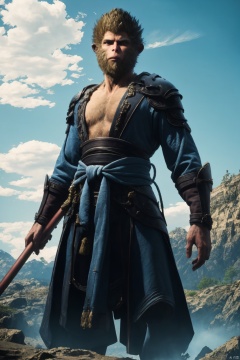 best quality, masterpiece, solo, 1boy, male focus, cloud, river, standing on cloud, scence, hill, looking at viewer, wukong \(black myth\), wukong,<lora:EMS-250332-EMS:0.700000>,<lora:EMS-174598-EMS:1.000000>
