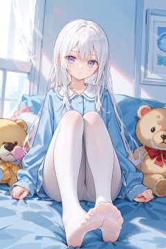 foot focus, 1girl, no shoes, pantyhose, white pantyhose, solo, long hair, purple eyes, soles, feet, stuffed toy, stuffed animal, white hair, long sleeves, looking at viewer, bangs, sitting, closed mouth, very long hair, sleeves past wrists, shirt, toes, blue shirt, foreshortening, full body, legs, teddy bear, knees up, curtains
