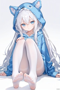 foot focus, 1girl, no shoes, solo, pantyhose, soles, long hair, white pantyhose, feet, bangs, very long hair, white hair, blue eyes, looking at viewer, hood, animal hood, white background, sitting, long sleeves, hood up, closed mouth, toes, hair between eyes, blue headwear, full body, foreshortening, knees up, sleeves past wrists, legs, hat, shadow, gradient, arm support, thighband pantyhose, gradient background