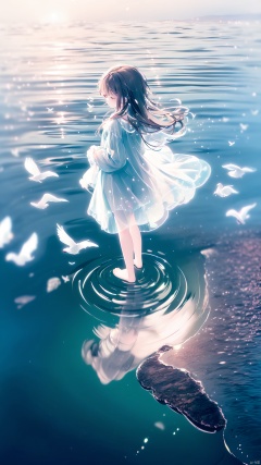 1girl, brown hair, long hair, closed eyes, (above ground), (water surface, reflection, surrounded by white birds), ((from above)), blurry, (full body, wide shot, panorama), (grey background), (shining, fog),,,