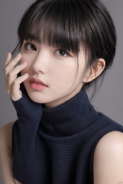 hy, 1girl, solo, black hair, looking at viewer, black eyes, short hair, sleeveless, turtleneck, sweater, head rest, bangs, grey background, lips, upper body, parted lips, turtleneck sweater, sleeveless sweater, hand on own face, realistic