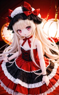 (cowboy shot,very long hair:1),ff40745b5cMI,1girl,dress,long hair,solo,blonde hair,red eyes,red theme,fruit,too many,frills,food,bow,hat,looking at viewer,