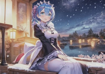 ((masterpiece), best quality, perfect anatomy,rem \(re:zero\),rem,maid,blue hair,1girl,solo,,<lora:rem:0.8>,,stars in the eyes,messy floating hair,colored inner hair,Starry sky adorns hair,depth of field,beautiful detailed sky,night,stars,(red plum blossom),((winter)),(((snowflakes))),((red and white flowers)),(starry sky),(sitting),((colorful)),scenery,lantern,(starfall),,